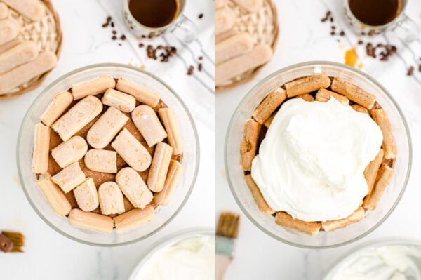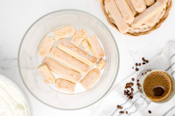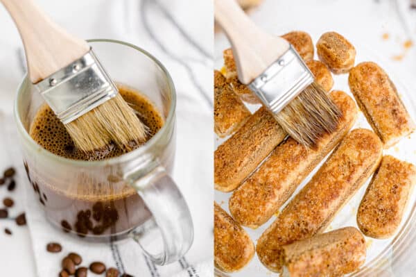 - Brush the ladyfingers with about 1/4 of chilled brewed coffee.