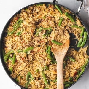 This ground turkey skillet recipe is a family favorite and never disappoints. The turkey and rice soak up all the tasty liquid from the chicken broth and canned tomato juice, and the green beans provide a built-in vegetable. Flavor-packed and made in one pan, itโs a great weeknight meal thatโs both delicious and hearty. It tends to appear on my meal planning list quite often. If you’re lucky enough to have leftovers, they reheat nicely for the next day, too.