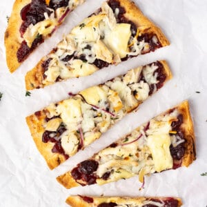 Enter…Thanksgiving leftover pizza! Yes, we’re turning some of those Thanksgiving leftovers, including the cranberry sauce, into a quick and easy naan flatbread pizza. With some fresh mozzarella and brie cheese for a gooey, melty topping that makes these naan pizzas simply irresistible.