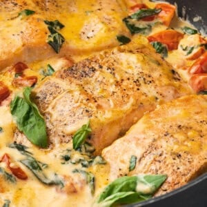 This Tuscan Butter Salmon recipe is super quick and easy to make, but tastes like something you’d order at a 5-star restaurant! Salmon fillets are pan-seared to perfection, then coated in an incredible creamy sauce made with Parmesan, garlic, cherry tomatoes, and baby spinach.