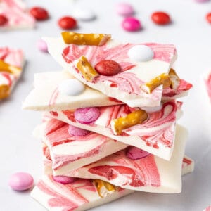 When it comes to easy no-bake treats, chocolate bark is always a winner – it’s incredibly versatile, tastes great, and is so easy to make. Today we’re sharing some pretty Valentine’s Day chocolate bark showcasing red, pink, and white colors and studded with pretzel pieces and M&Ms.