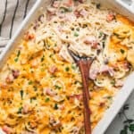 Ham tetrazzini is a comforting baked pasta casserole made with tender spaghetti, diced ham, and a creamy, cheesy sauce. It’s an easy, classic dinner that’s perfect for using up leftover ham or feeding a hungry family.See below the recipe card for step-by-step images.