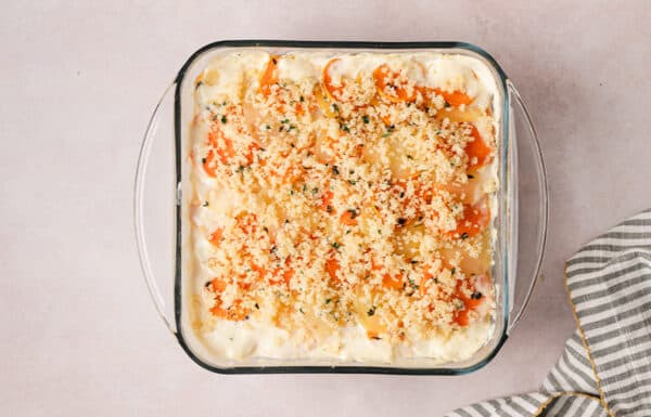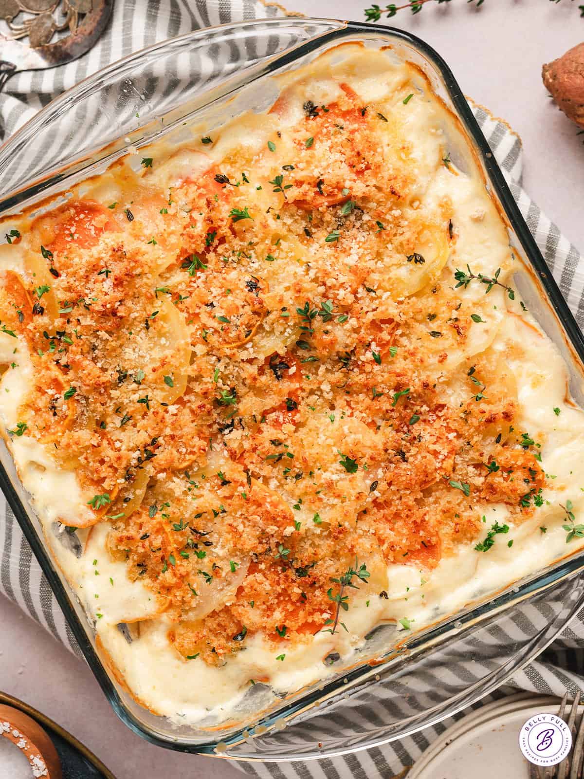 Yukon and Sweet Potato Gratin combines buttery Yukon gold potatoes and sweet garnet yam slices covered in a delightfully rich and creamy sauce with fresh thyme throughout. It’s baked until perfectly tender then finished with a crispy panko topping. It’s such a delicious side dish!