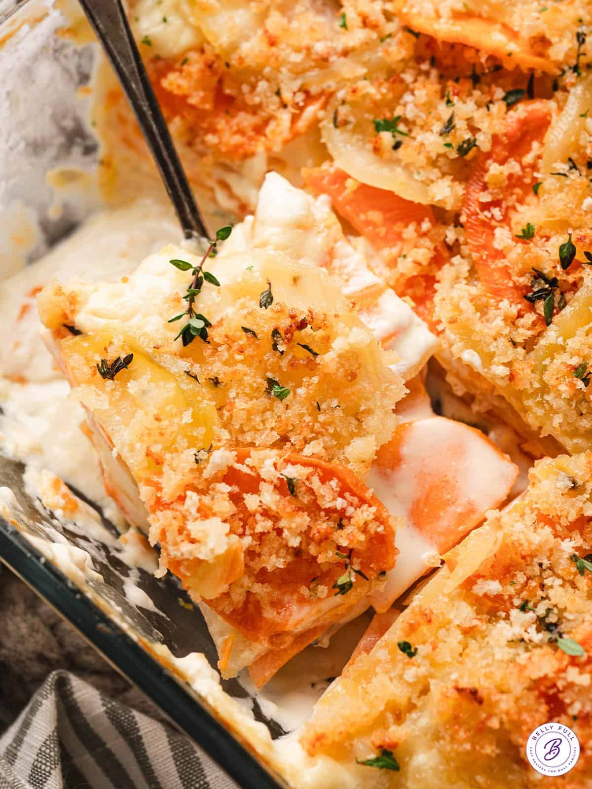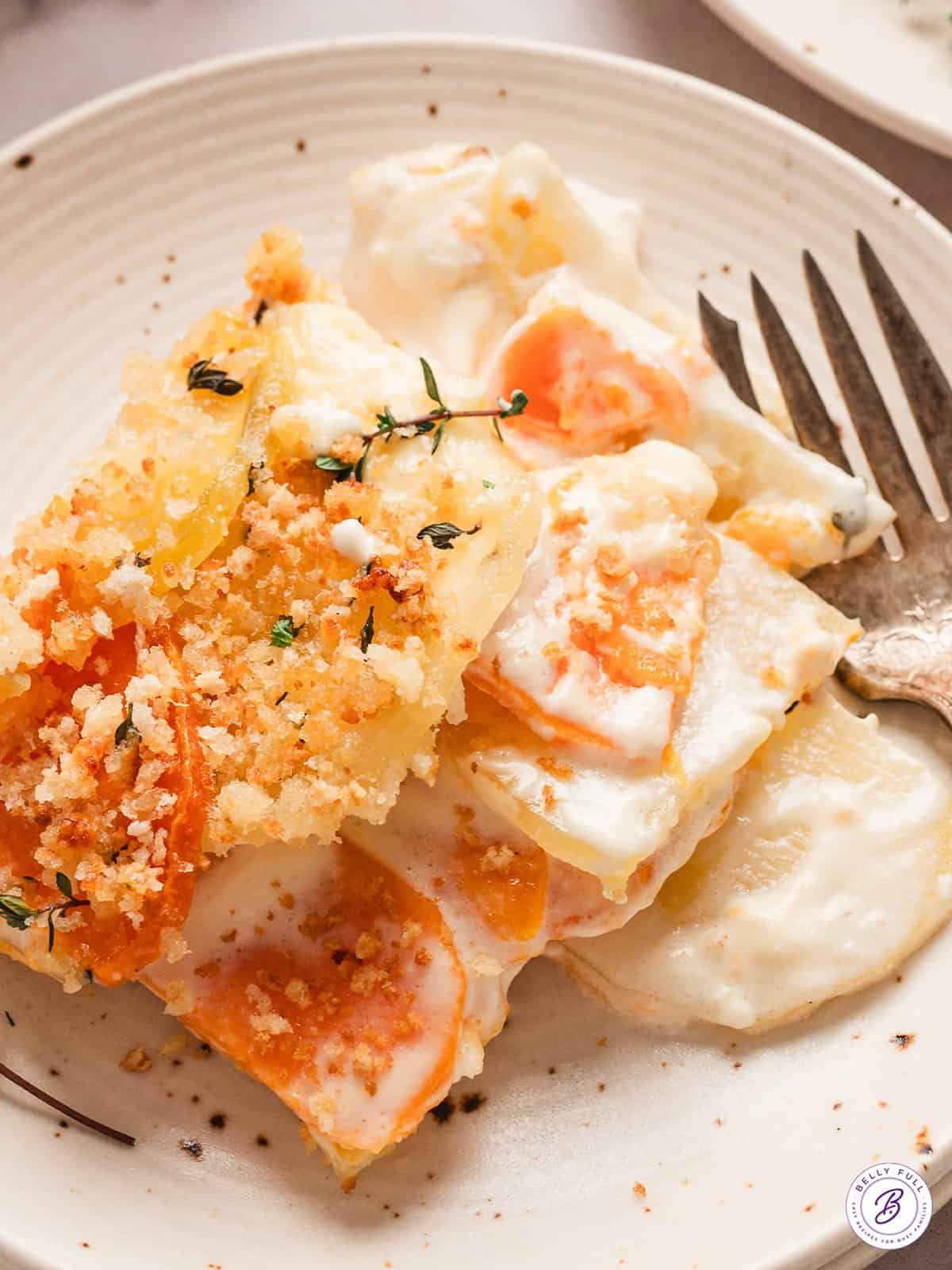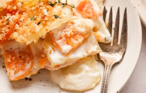 This sweet potato and Yukon gold gratin makes a stunning side during the holidays or any special occasion dinner. It’s a great side for Christmas or Easter ham and Thanksgiving turkey but also dishes like bacon wrapped pork tenderloin or honey glazed salmon anytime.