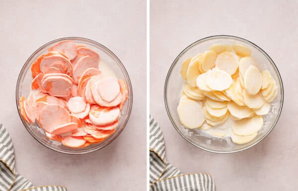 - Season 2 cups heavy cream with salt and white pepper to taste and divide into two mixing bowls. Toss 3 peeled and 1/8-inch sliced yams in one bowl and 4 peeled and 1/8-inch sliced Yukon gold potatoes in the other to coat with the cream.