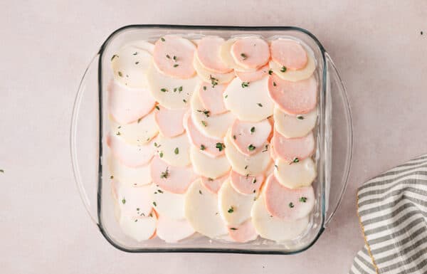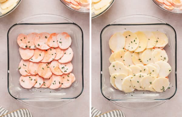 - Slightly overlap the yams in a single layer in the prepared baking dish. Sprinkle with 1 teaspoon of fresh chopped thyme. Then slightly overlap the Yukon gold potatoes on top of the yams in a single layer, followed by another teaspoon thyme. Repeat this process until the dish is filled just below the top. (Alternatively, you can overlap both types of potatoes in each layer for more of a checkerboard look.)